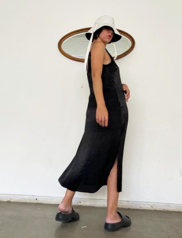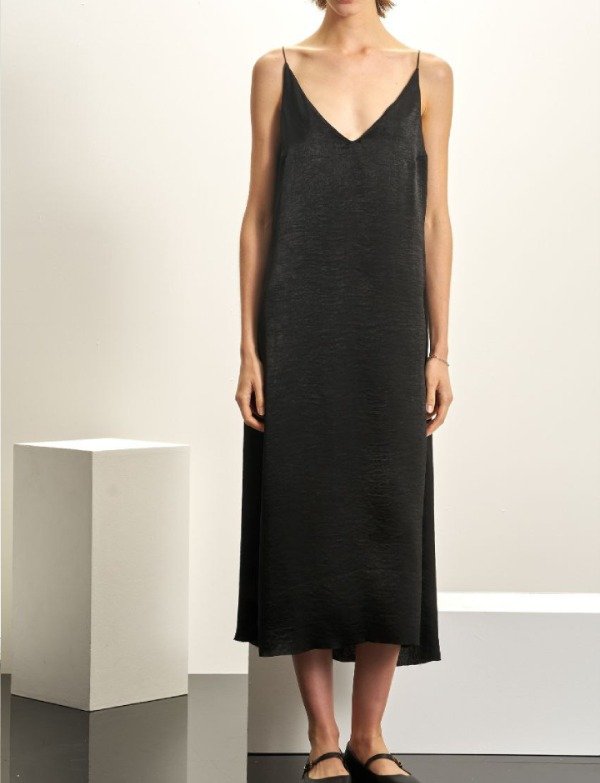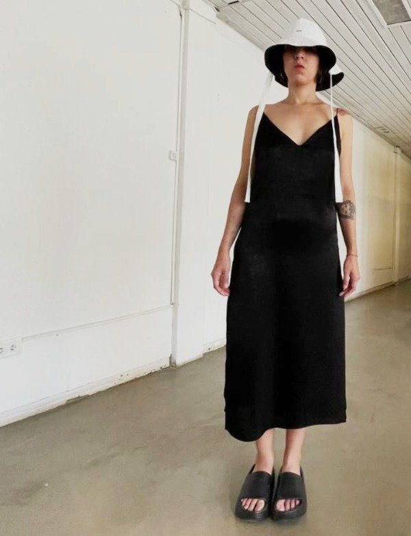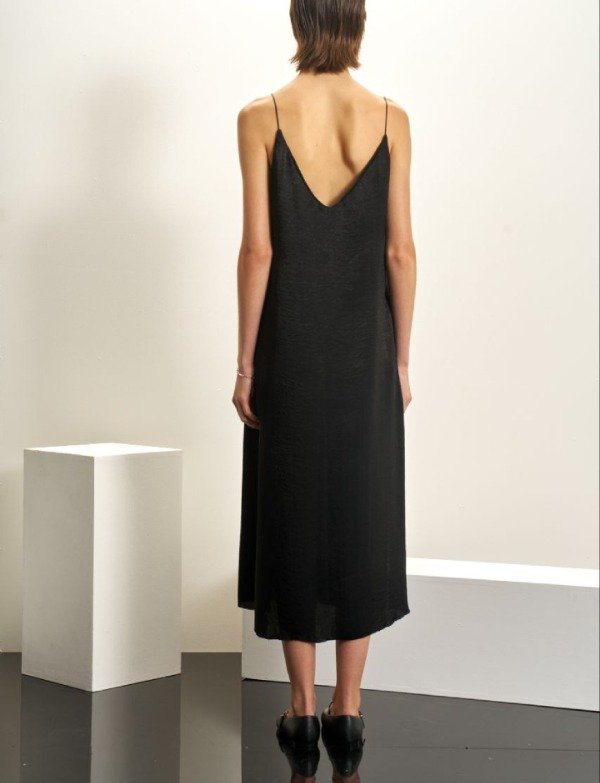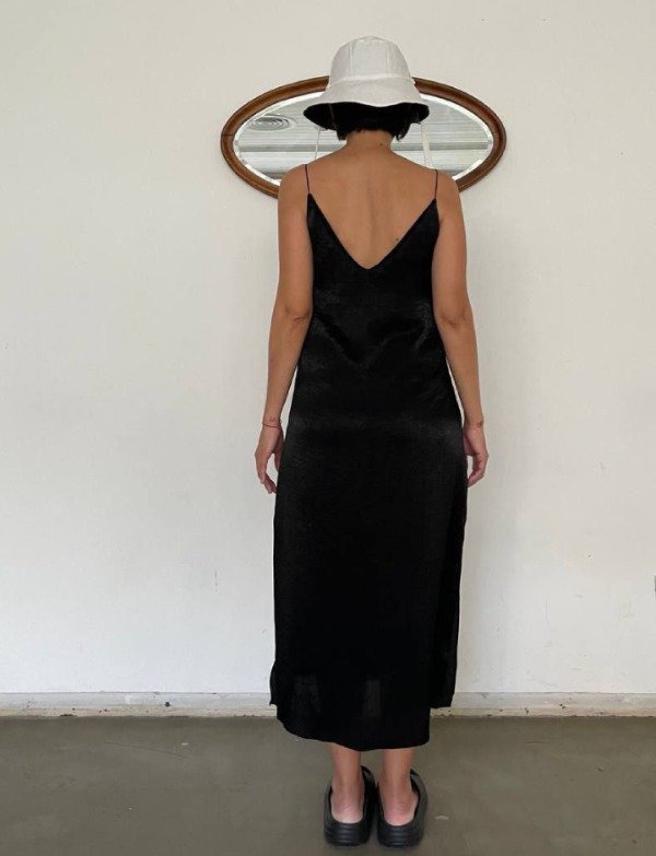 vestido confeccionado en lino satinado, con tiras de finitas de seda, escote en v espalda y delantera, con tajos en laterales desde la rodilla hasta el final. Se puede usar de día con sandalias ó zapatillas, con una remera arriba o abajo y de noche con un corpiño de encaje o solo y tacos ó botas, muy versátil